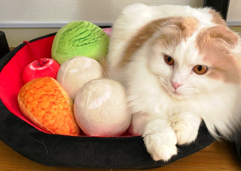 前から欲しかった、フェリシモの「あんみつにゃんこクッション」を